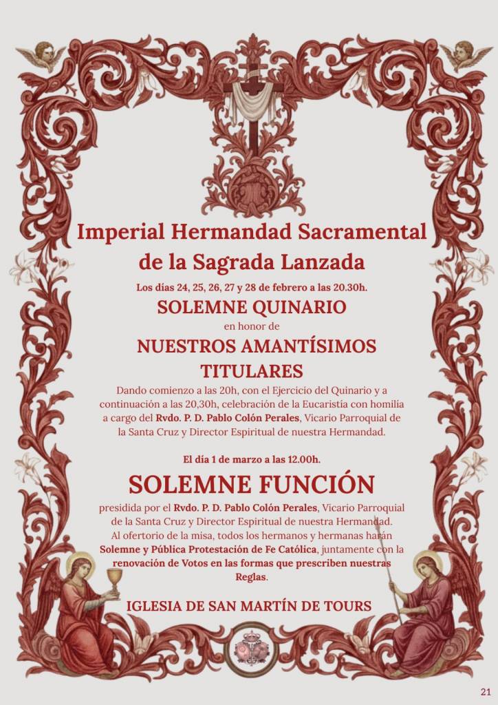 Los días 24, 25, 26, 27 y 28 de febrero de 2026, en la Iglesia de San Martín, celebración a las 20.00 horas del Solemne Quinario en honor a nuestros Sagrados Titulares.