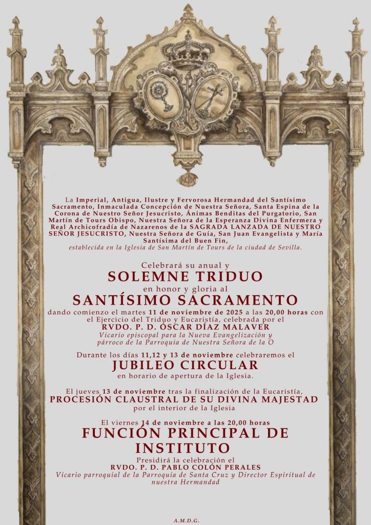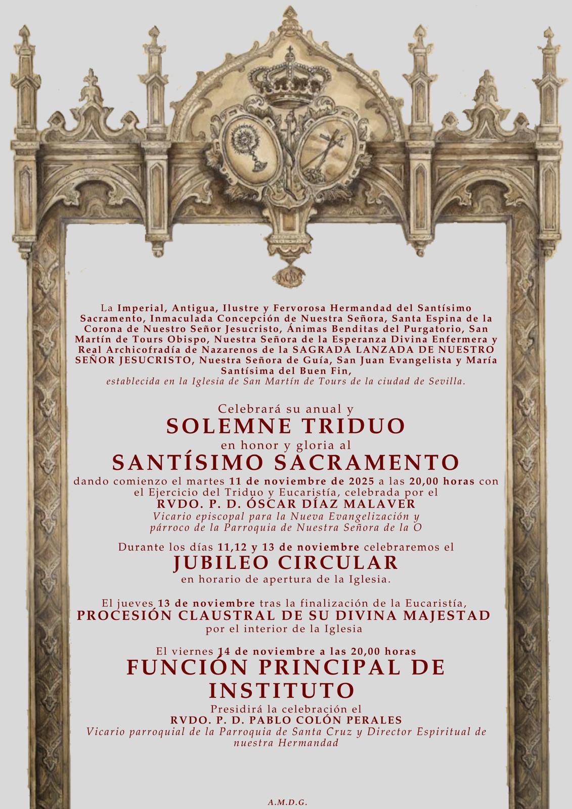 La Imperial Archicofradía de la Sagrada Lanzada celebrará Solemne Triduo al Santísimo Sacramento en la Iglesia de San Martín de Tours (Sevilla).