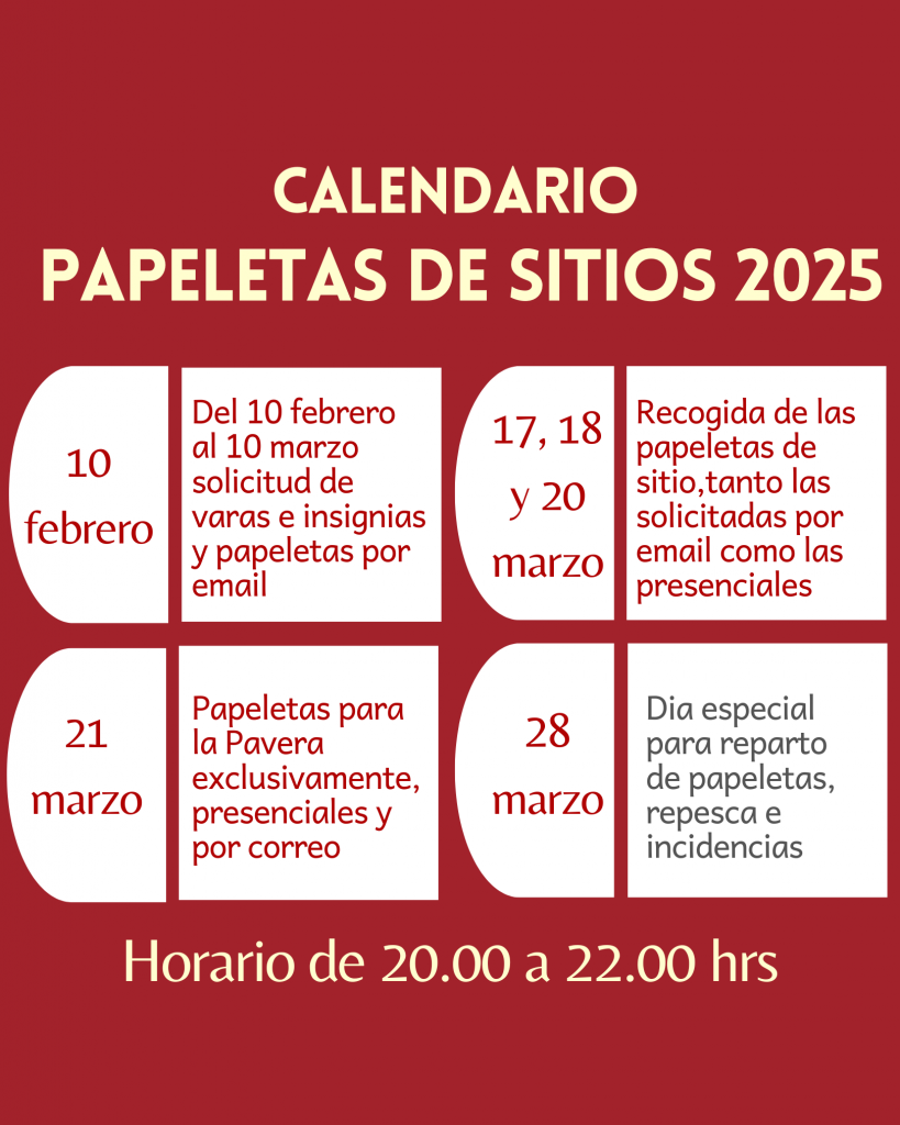 Asi mismo os recordamos de nuevo las fechas más importantes de la semana próxima, para el reparto de las Papeletas de Sitio.