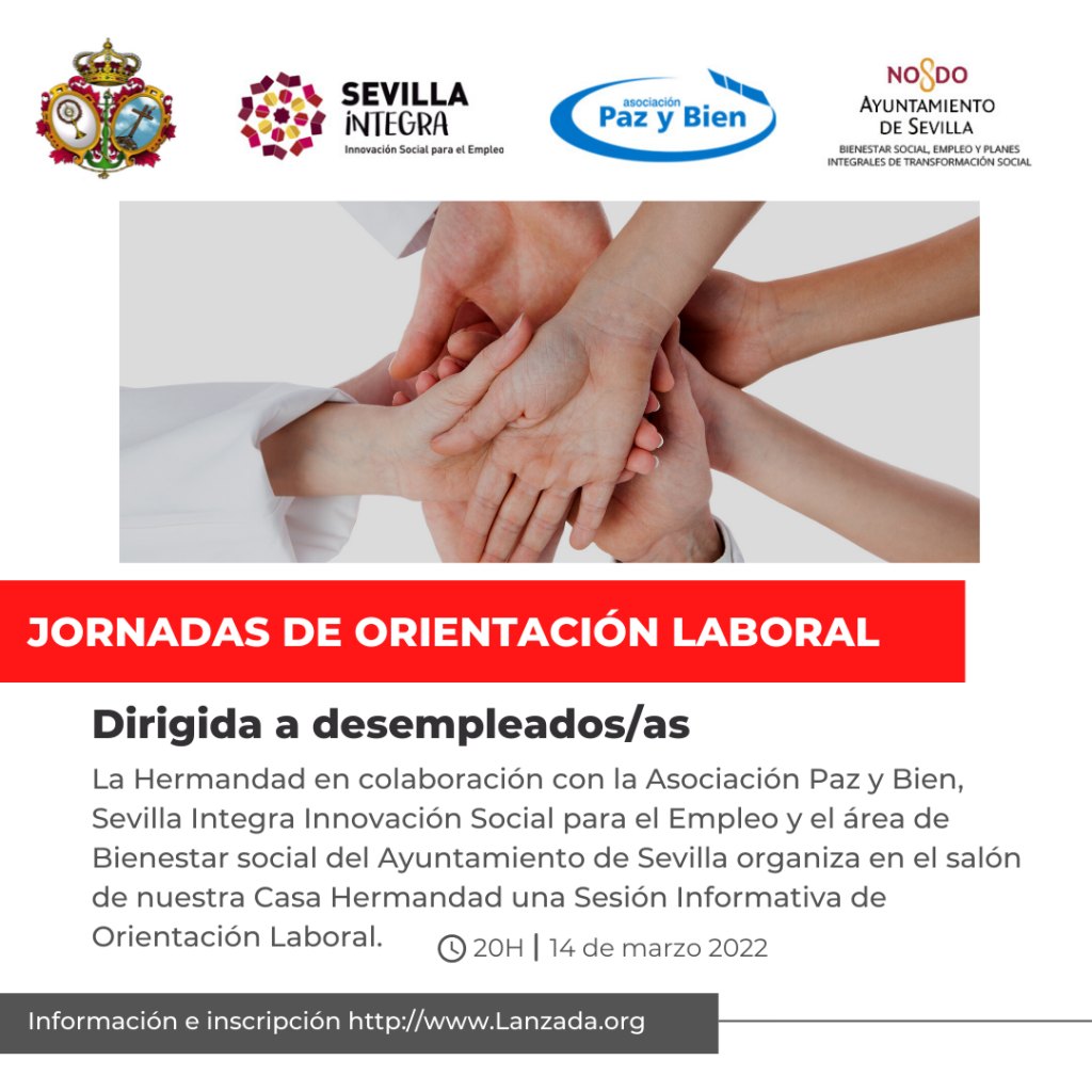 Nuestra Hermandad en colaboración con la Asociación Paz y Bien, Sevilla Integra Innovación Social para el Empleo y el área de Bienestar social del Ayuntamiento de Sevilla organiza para el próximo día 14 de marzo a las 20 h, en el salón de nuestra Casa Hermandad una Sesión Informativa de Orientación Laboral.