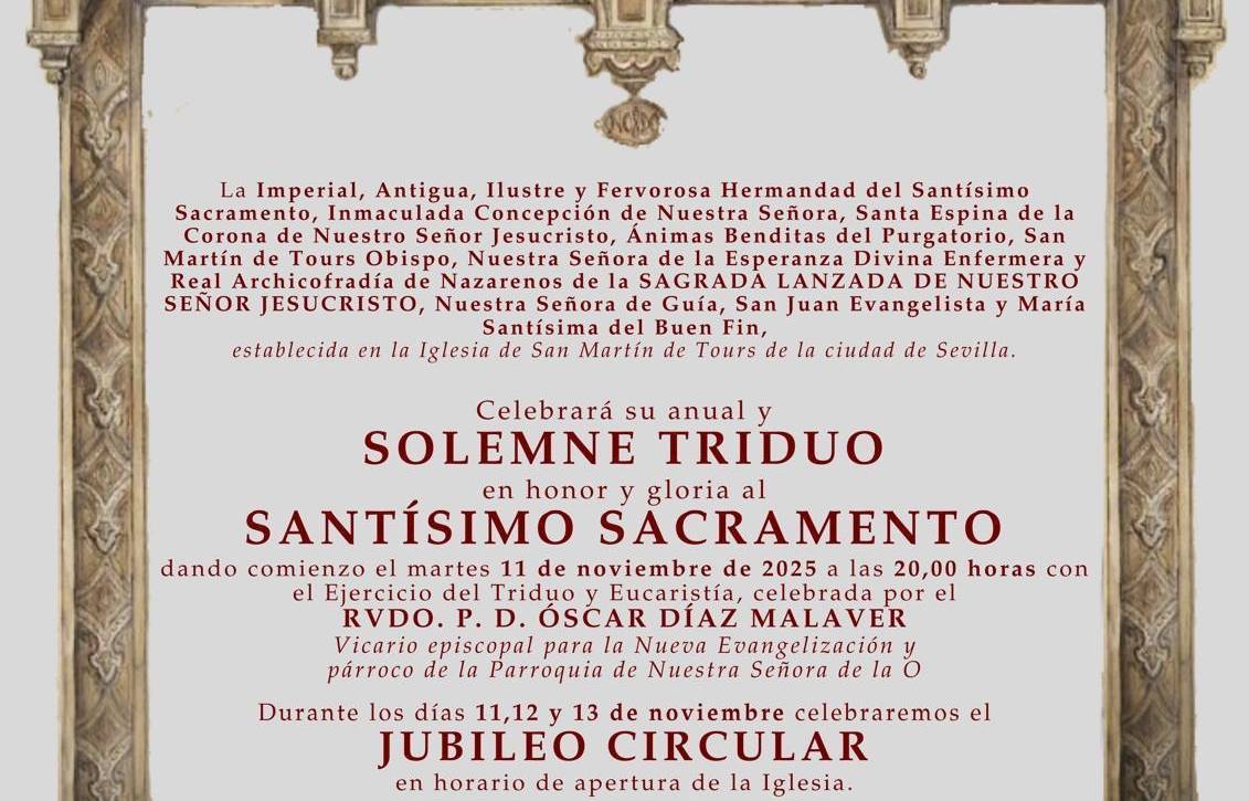 La Imperial Archicofradía de la Sagrada Lanzada celebrará Solemne Triduo al Santísimo Sacramento en la Iglesia de San Martín de Tours (Sevilla). El Triduo tendrá lugar los días 11,…