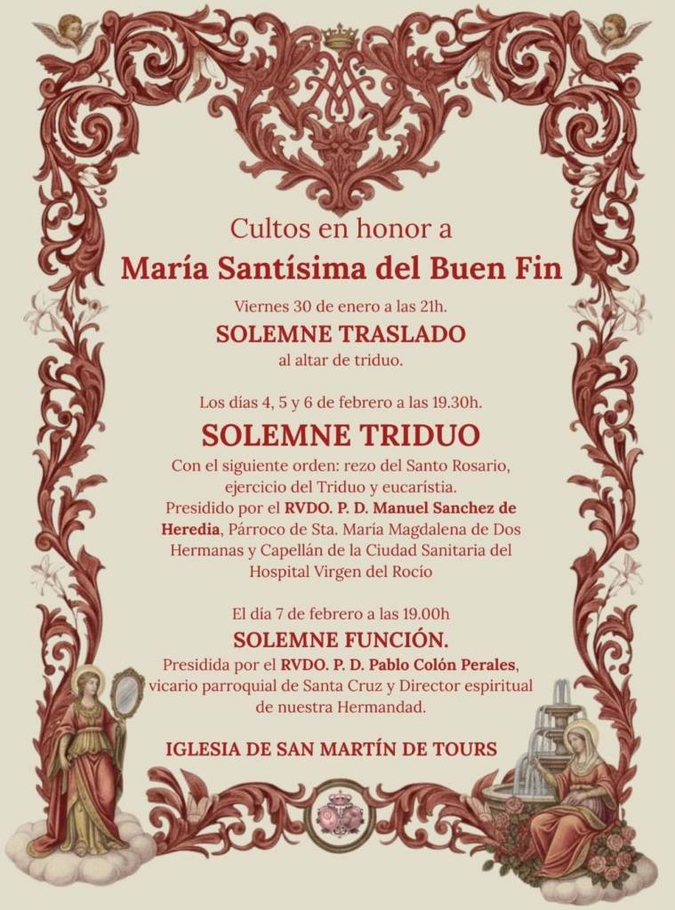 La Hermandad de la Sagrada Lanzada celebrará Solemne Triduo en honor a María Santísima del Buen Fin, que tendrá lugar los días 4, 5 y 6 de febrero en la Iglesia de San Martín.