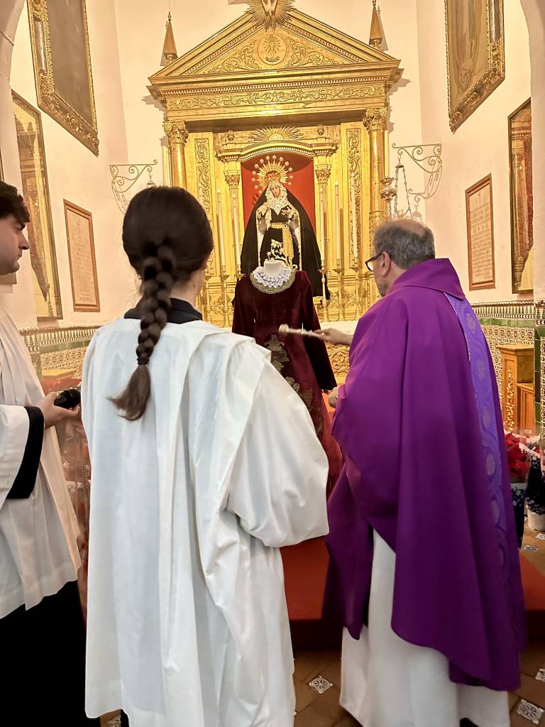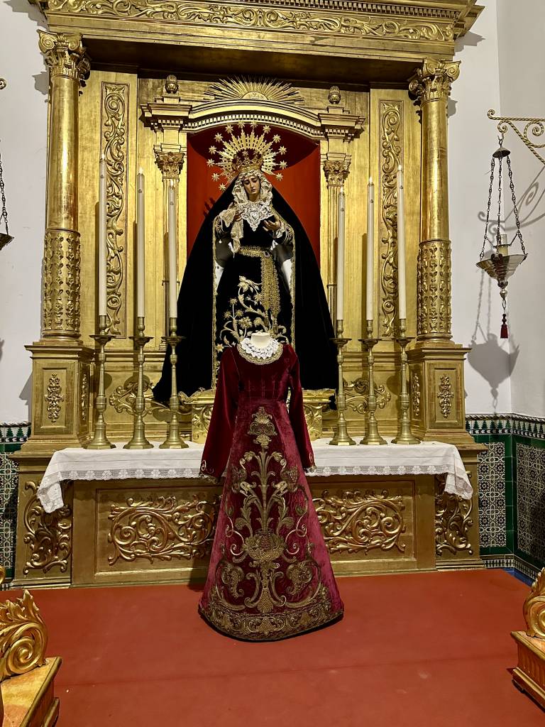 Ayer se presentó la nueva saya para María Santísima del Buen Fin. Esta hermosa pieza ha sido donada por un grupo de hermanos para engrandecer el ajuar de nuestra bendita Madre. La saya fue adquirida en un anticuario, lo que hizo necesario un proceso de limpieza y restauración, llevado a cabo por el bordador Joaquín Salcedo. La pieza original consistía en un paño antiguo bordado con hilos de oro sobre terciopelo de seda natural en color burdeos.